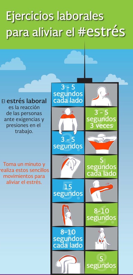 ¿Te sientes estresado o estresada en el trabajo? Hoy, te dejamos unos ejercicios sencillos para aliviar el estrés laboral. Te llevarán muy poco tiempo ponerlos en práctica y a cambio, te ayudarán a tener una mejor calidad de vida en el trabajo. Recuerda que con Fisioterapia también podemos tratar el estrés. Llámanos!